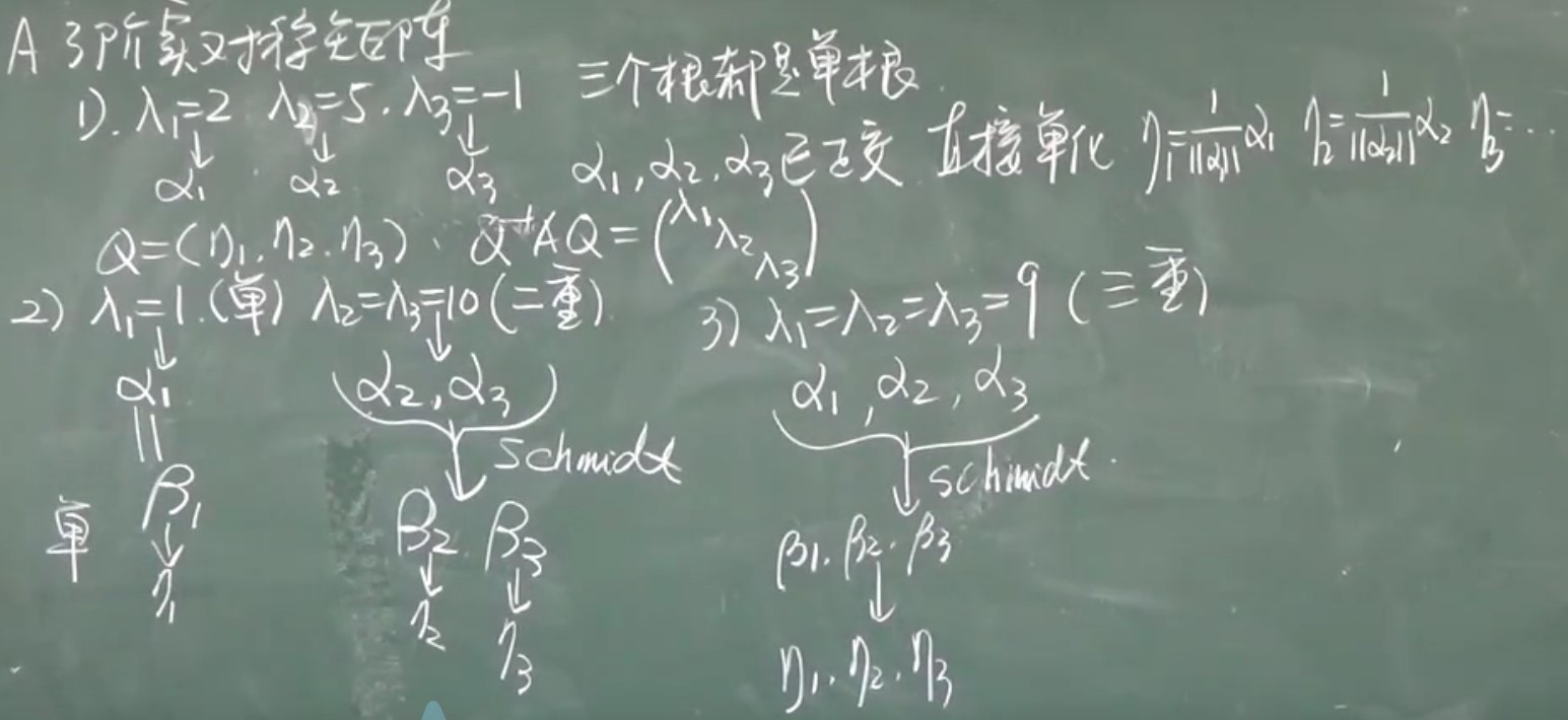 - 一个单根,一个二重根,因为单根对应特征向量与二重根对应的正交,所以只需做二重根对应特征向量的施密特正交化,再做单位化
