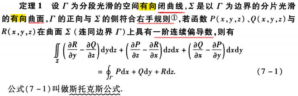 右手法则:当右手除拇指外的四指依的绕行方向时,拇指所指的方向与∑上法向量的指向相同。这时称Γ是有向曲面∑的正向边界曲线