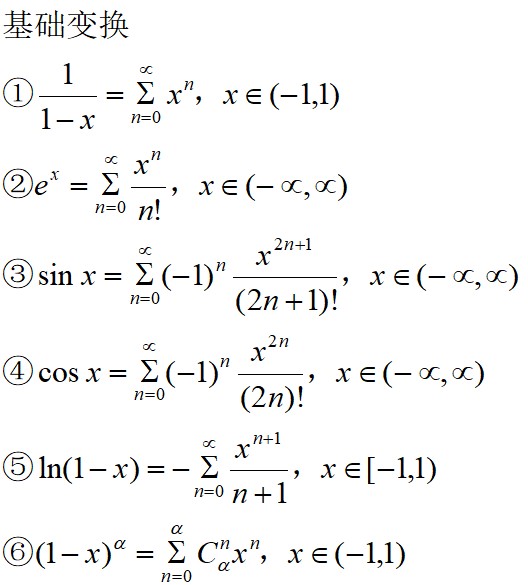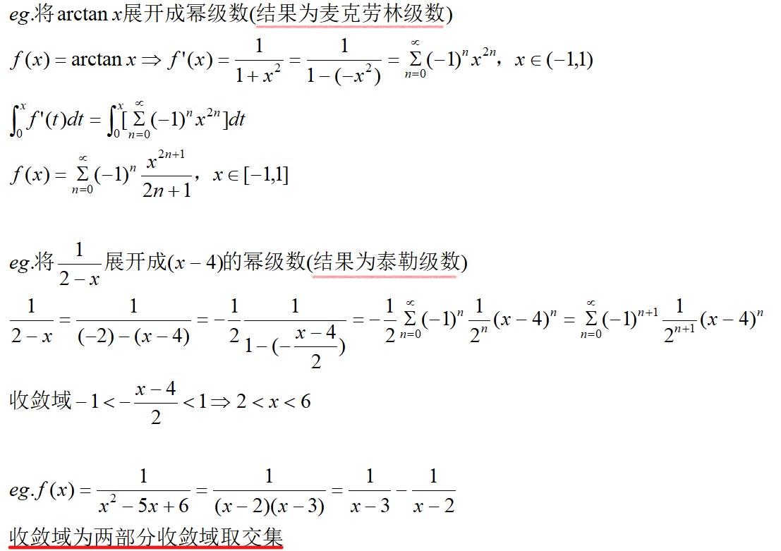 例题:(未指定x0使用麦克劳林级数,指定x0使用泰勒级数)判断收敛域:先继承基础变换中的收敛域,再根据实际情况判断端点①是否有意义②是否收敛若变化过程中涉及求导、求积分,应该判断端点是否收敛