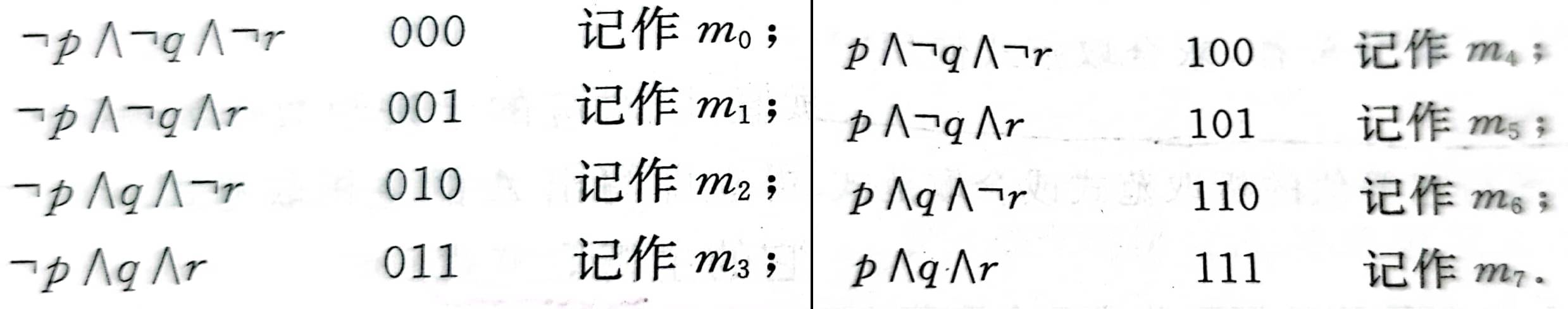 比如三个变元p,q,r就有8个极小项: