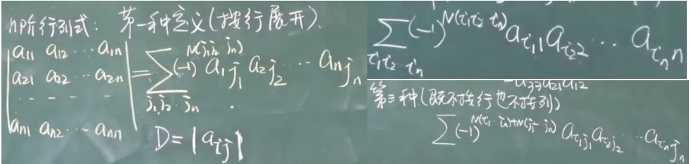 第二种定义:列标取标准排列,行标取排列的所有可能,从不同行不同列取出n个元素相 乘,符号由行标排列的奇偶性决定的,一共由n!项。