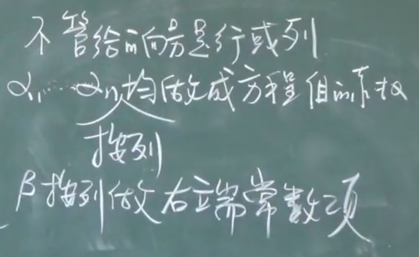 - 定义:β,α1,α2,······,αn是n维向量,若存在组合系数k1,k2,······,kn(可全取0),使β=k1α1+k2α2+······+knαn成立,则称β为α向量组的线性组合,或者β可以用α向量组线性表示。