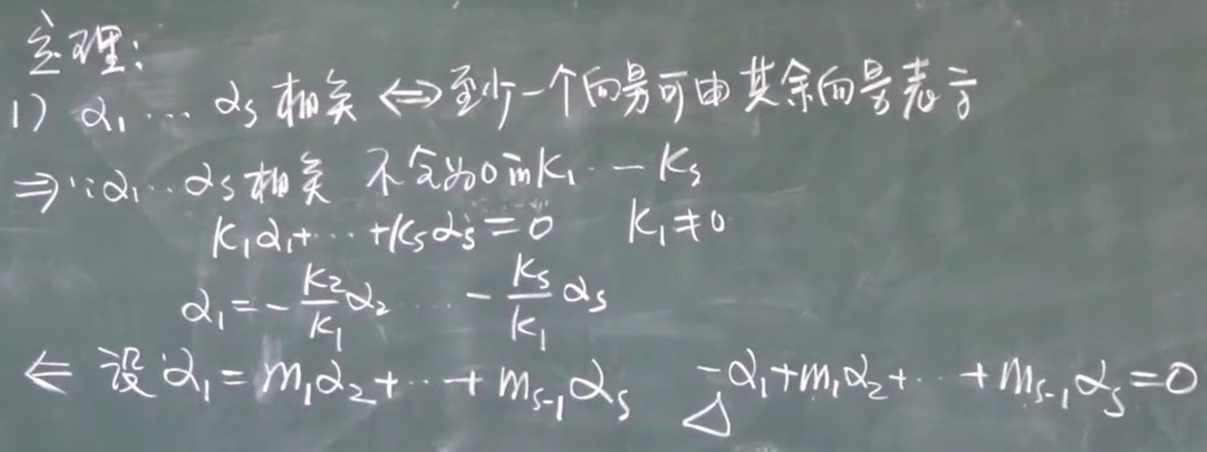 - 定理1:向量组α1,α2,···,αs(s≥2)线性相关,则向量组中至少有一个向量可由其余s-1个向量线性表示