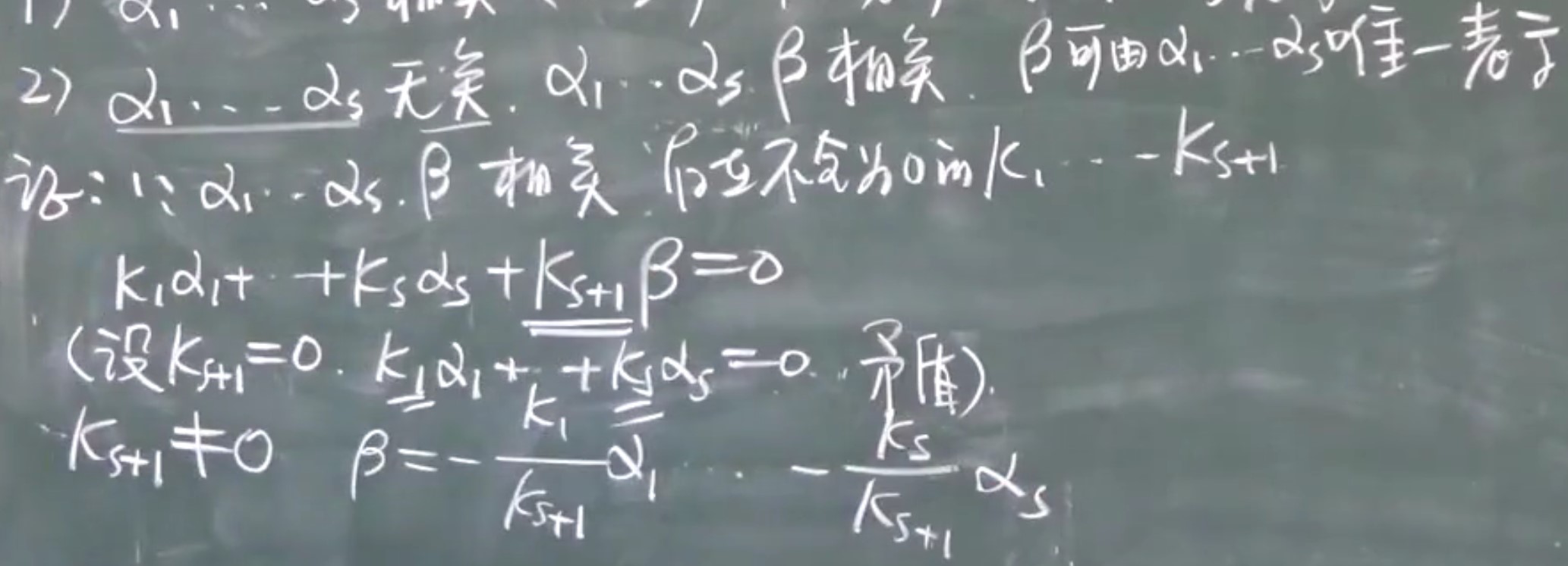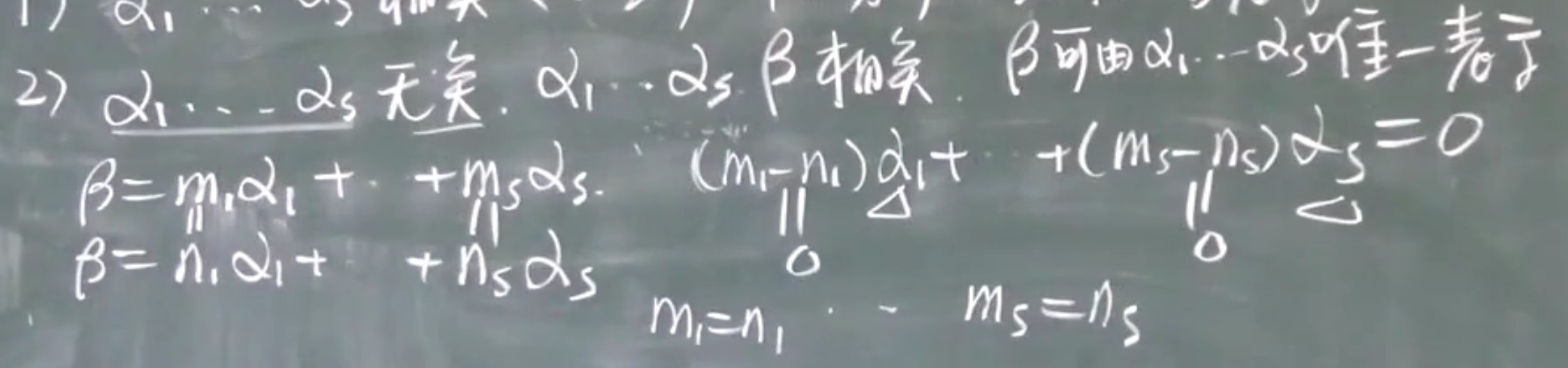 - 定理2:设向量组α1,α2,···,αr线性无关,而向量组α1,α2,···,αr,β线性相关,则β能由α1,α2,···,αr线性表示,且表示式是唯一的
