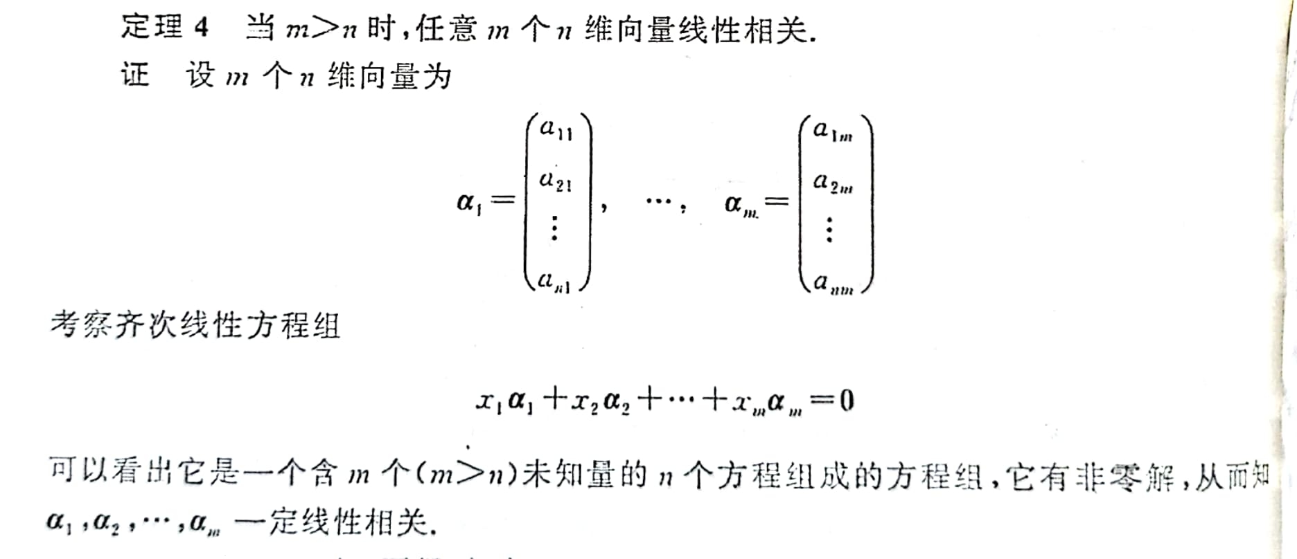 - 定理3:当m>n时,任意m个n维向量线性相关