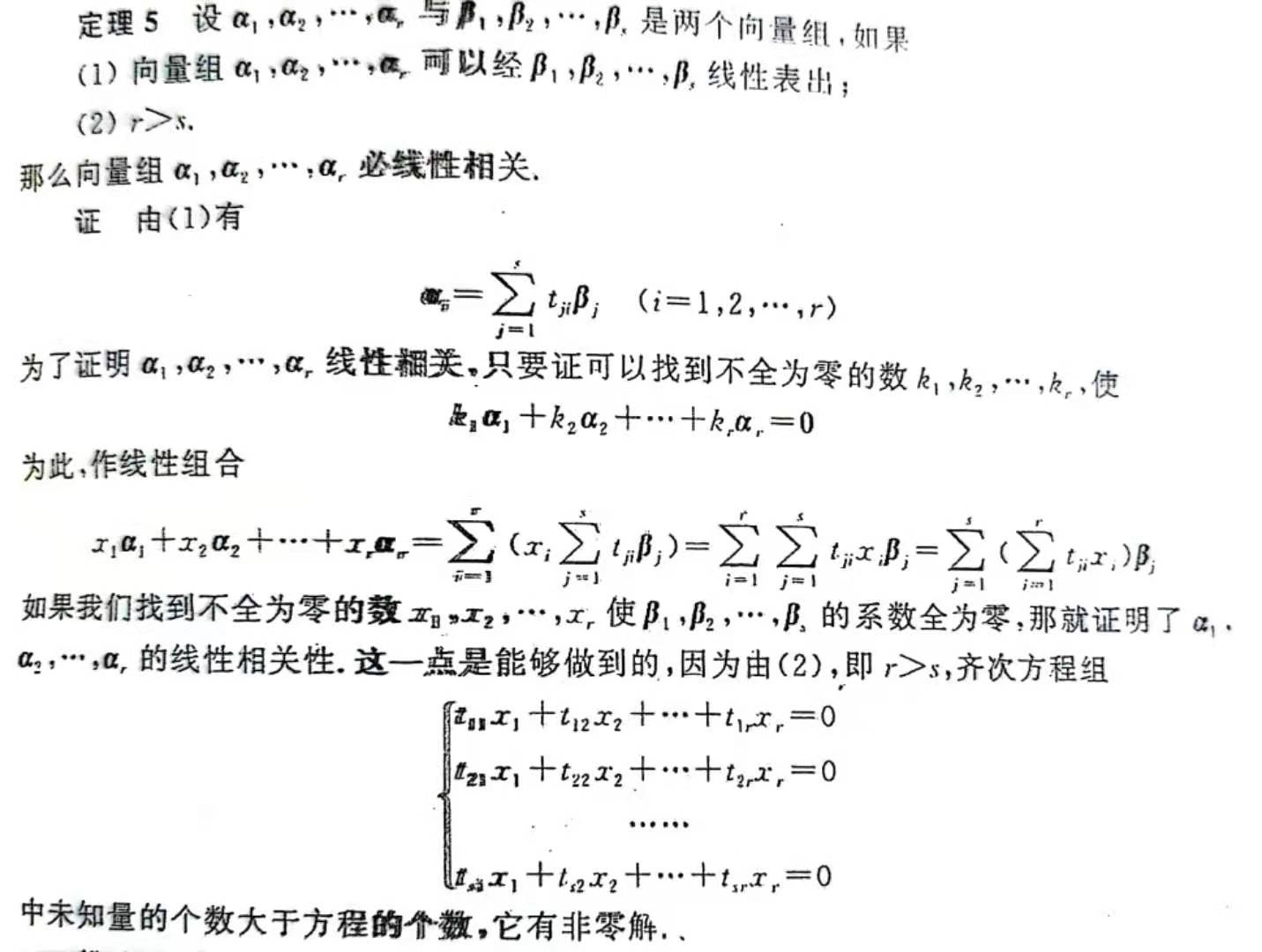 - ***定理4(替换定理):设α1,α2,···,αr与β1,β2,···,βs是两个向量组,如果①向量组α1,α2,···,αr可以经β1,β2,···,βs线性表出;②r>s,那么向量组α1,α2,···,αr线性相关